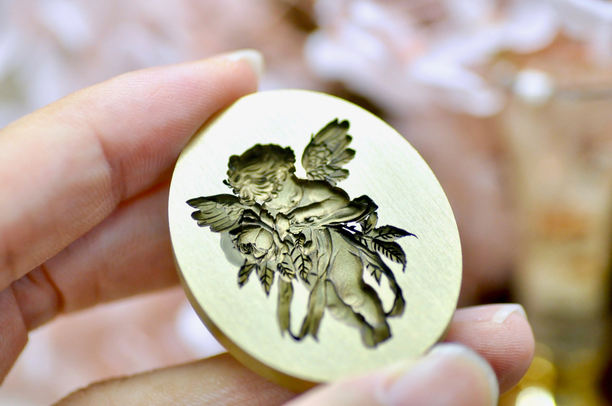 Crafted with intricate depth and delicate artistry, this stamp leaves a raised impression that feels as intimate as its imagery. The cherub’s serene contours and the rose’s fine detailing evoke a sense of heartfelt guardianship—perfect for adding a romantic, celestial touch to letters, invitations, journals, or cherished keepsakes.