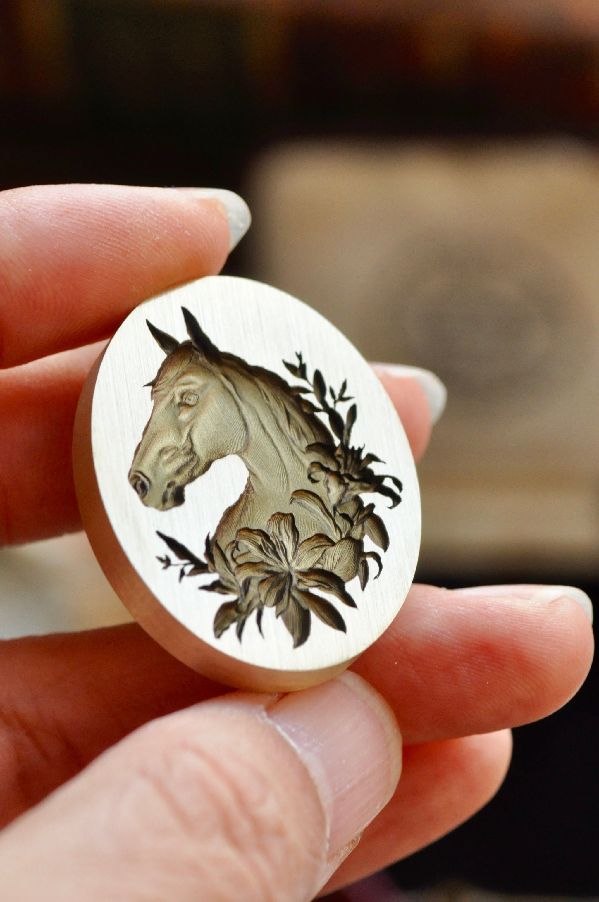 Two horses, turned toward one another—a quiet conversation in wax and bloom.
