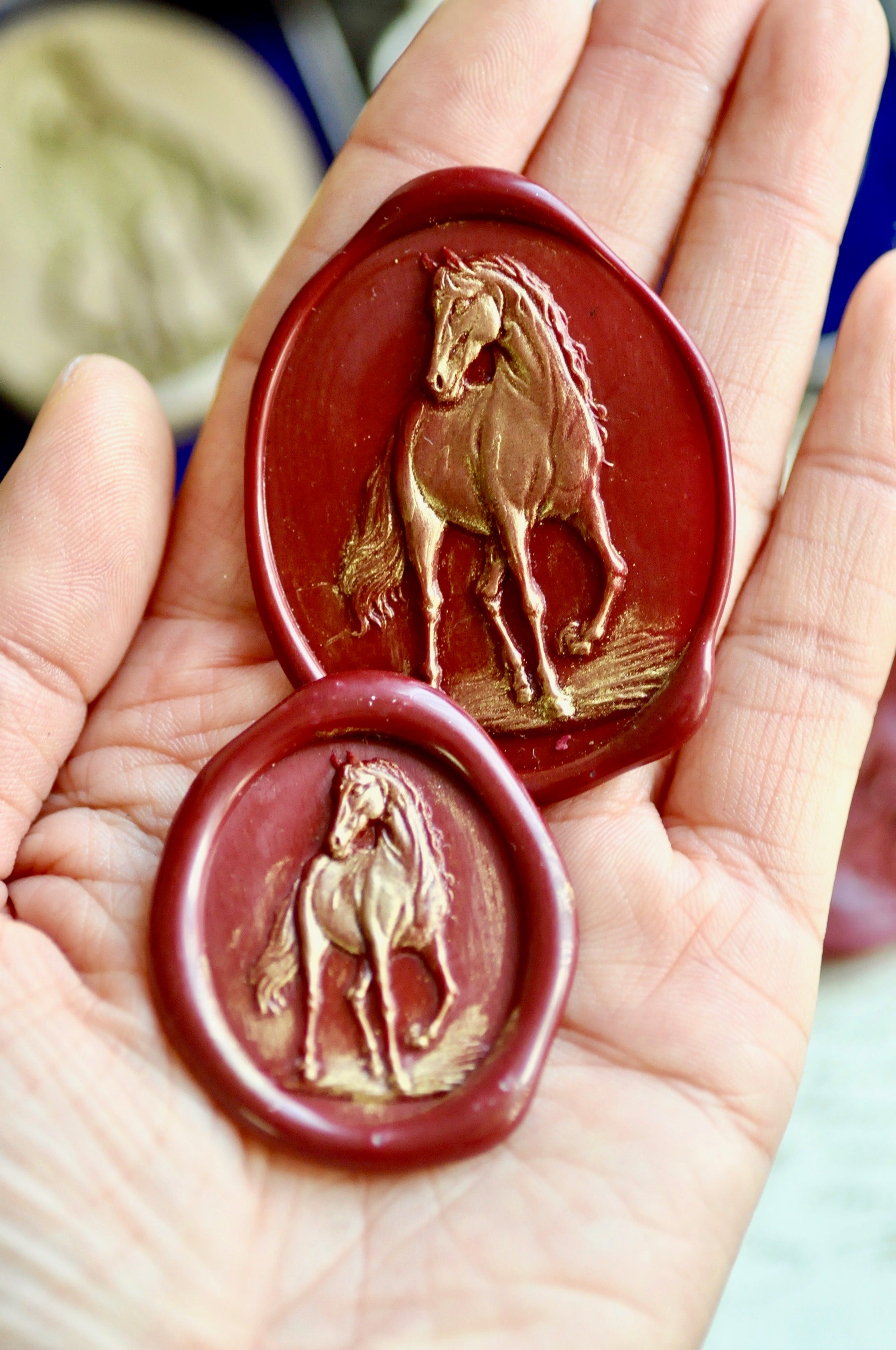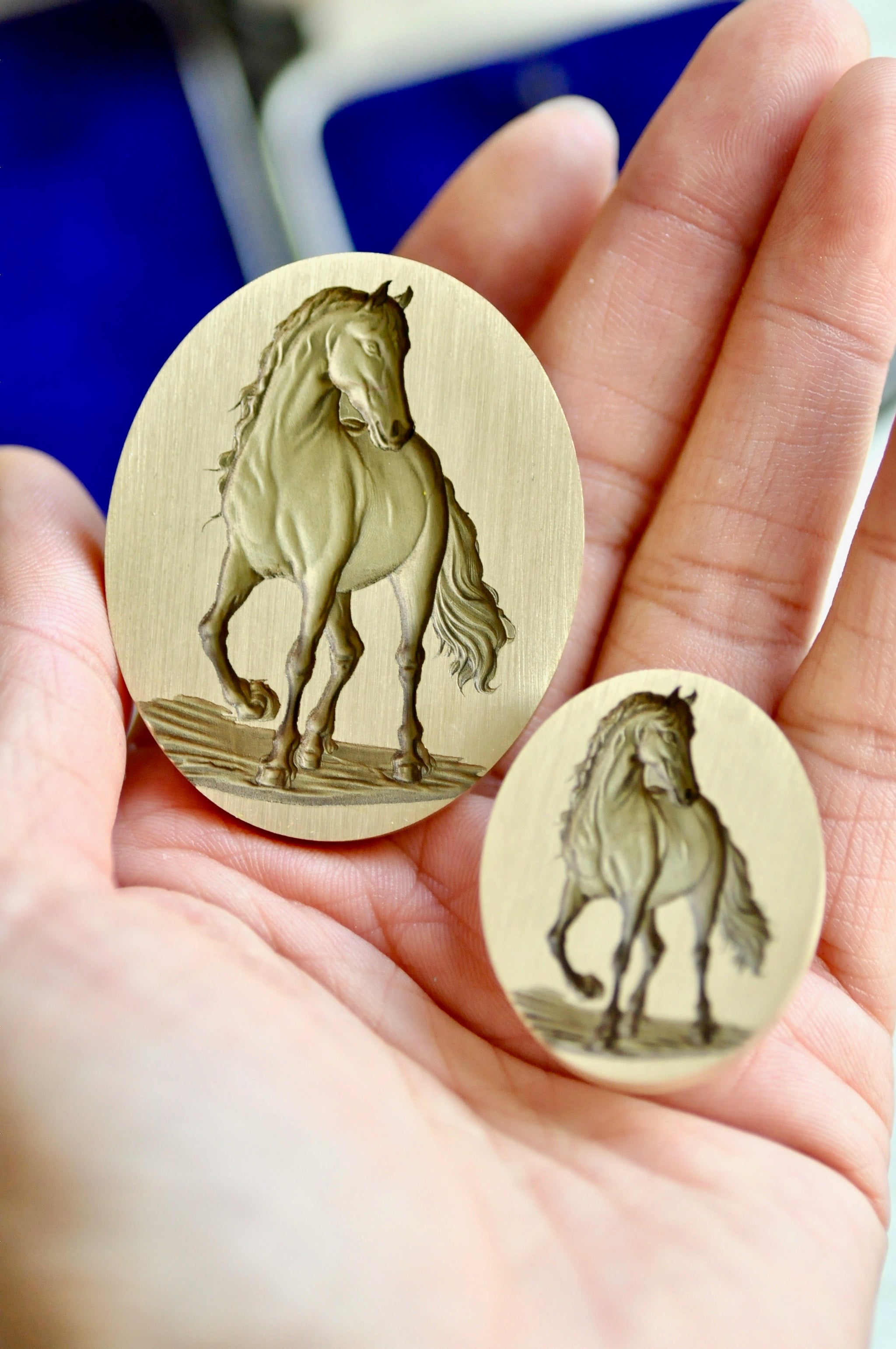 The horse has long been a companion to human aspiration—a symbol of freedom, strength, and journeying with grace. In this rendering, there is a softness to its stance, a deliberate calm that speaks not of hurry, but of presence. The vertical oval frame lends a classic, refined shape, reminiscent of a locket or a vintage pendant, making each impression feel like a keepsake.