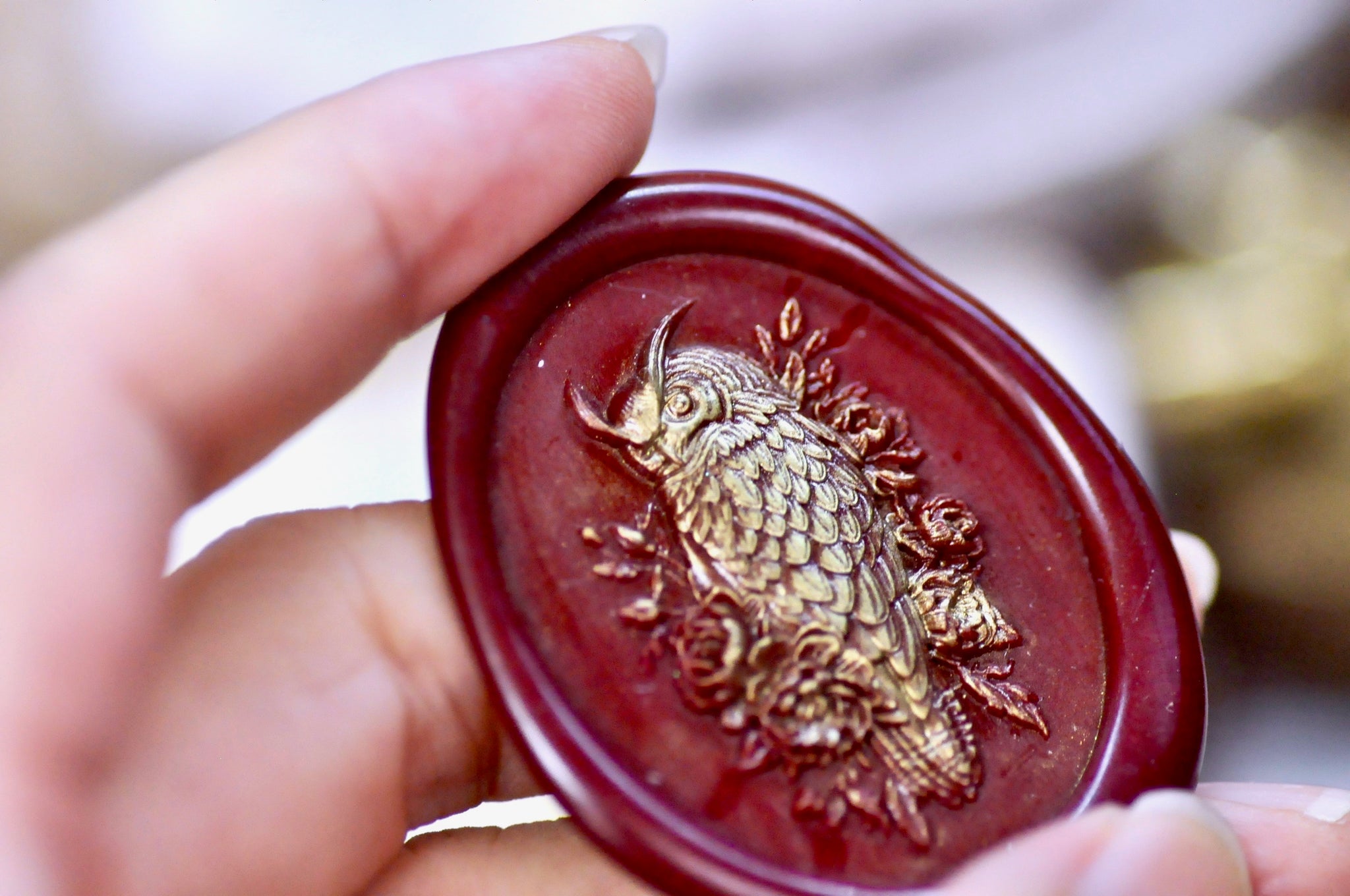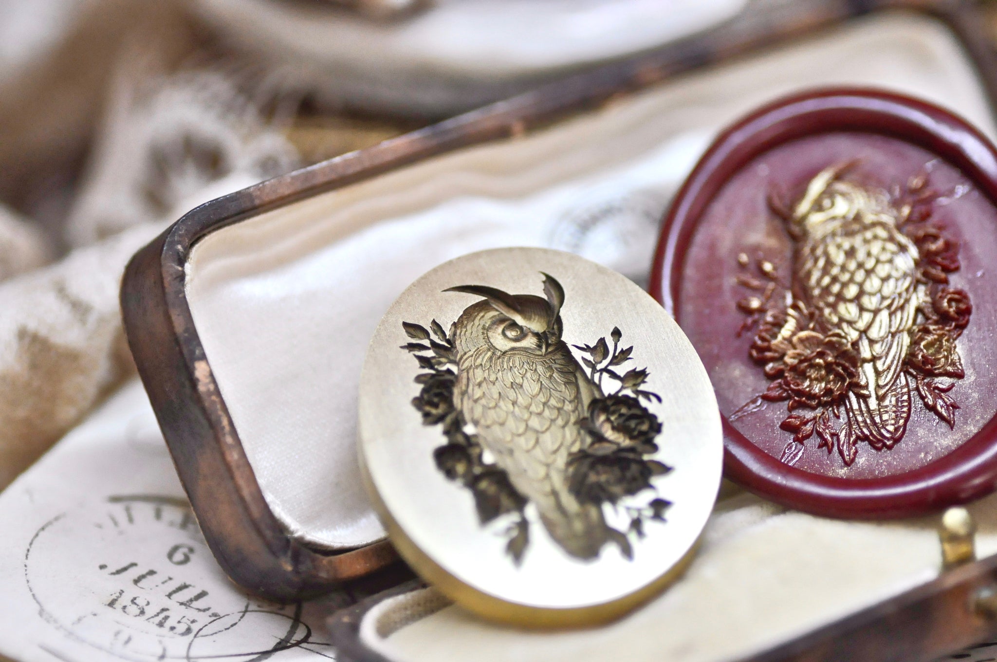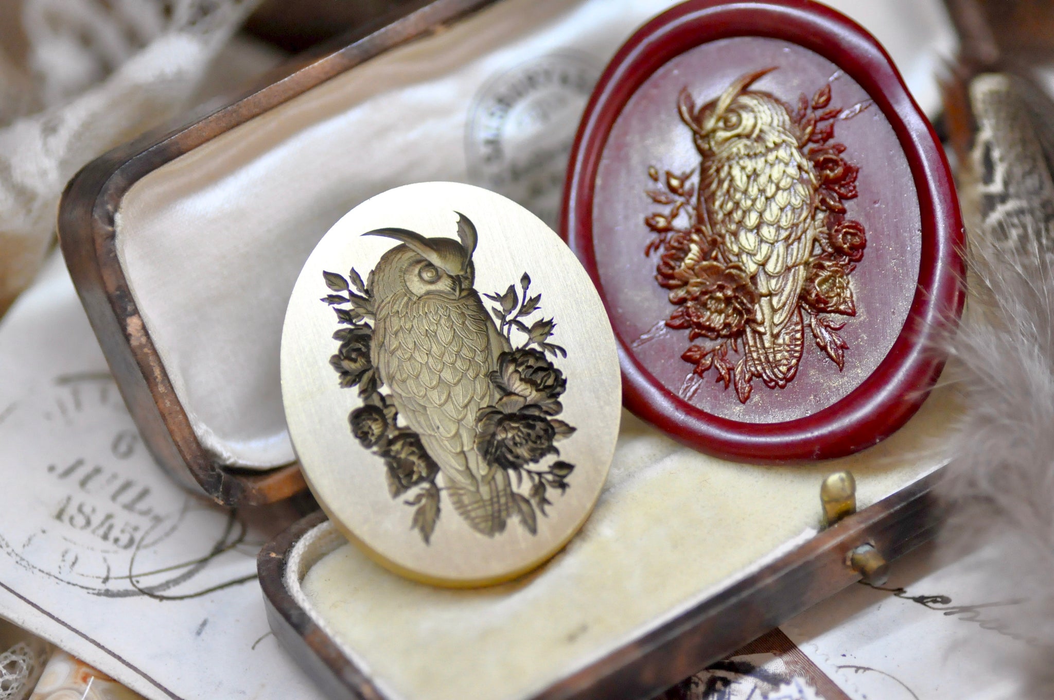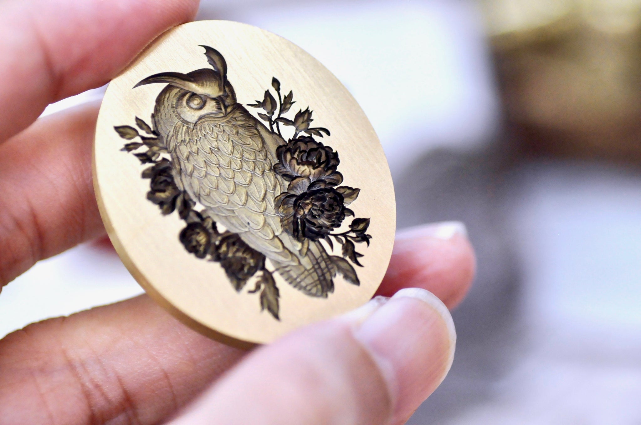 It features an intricately engraved horned owl design, showcasing its graceful feathers and elegant form surrounded by delicate floral elements. The motif captures the timeless beauty of nature, with fine detailing that ensures crisp, artful impressions.