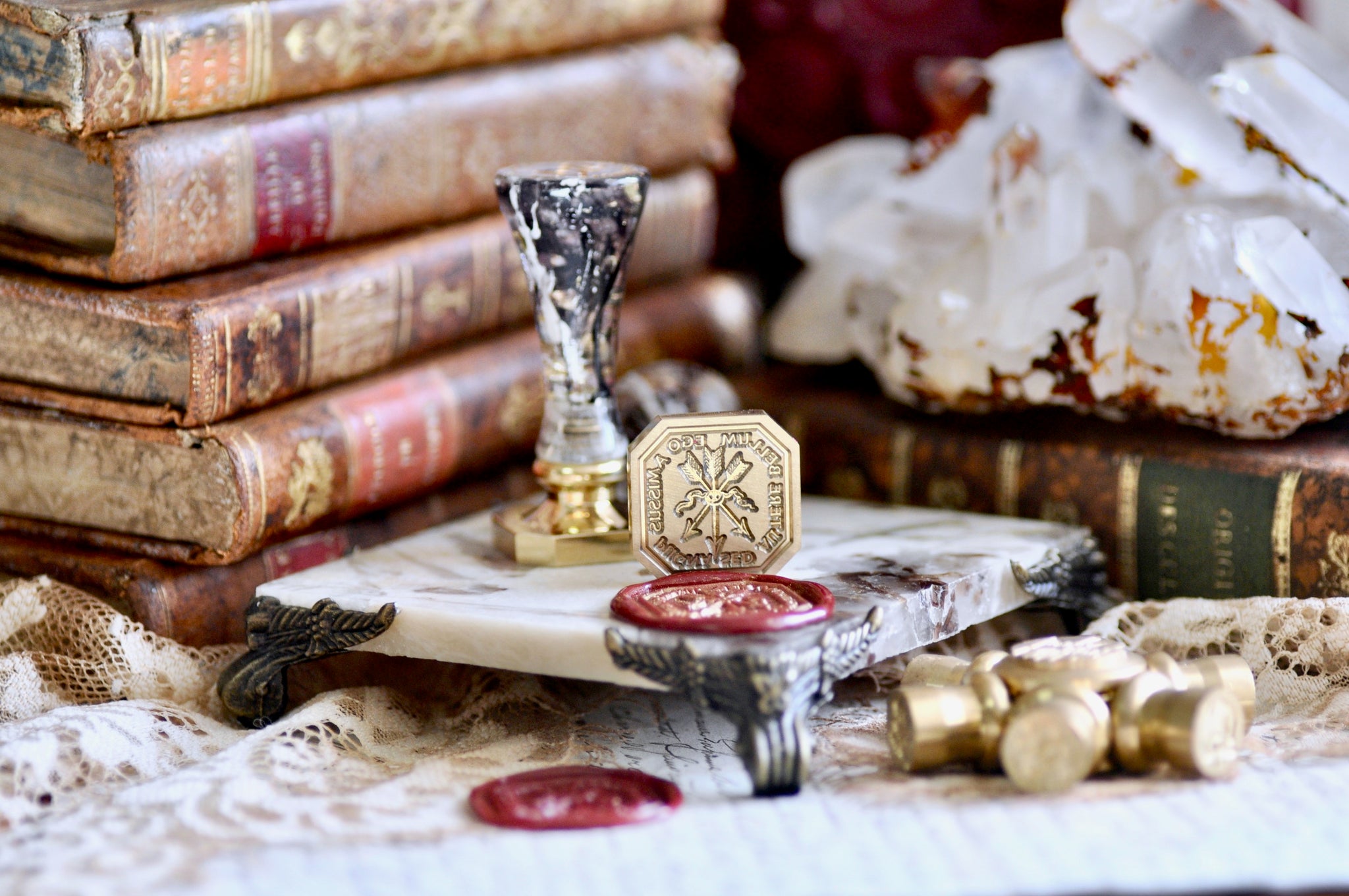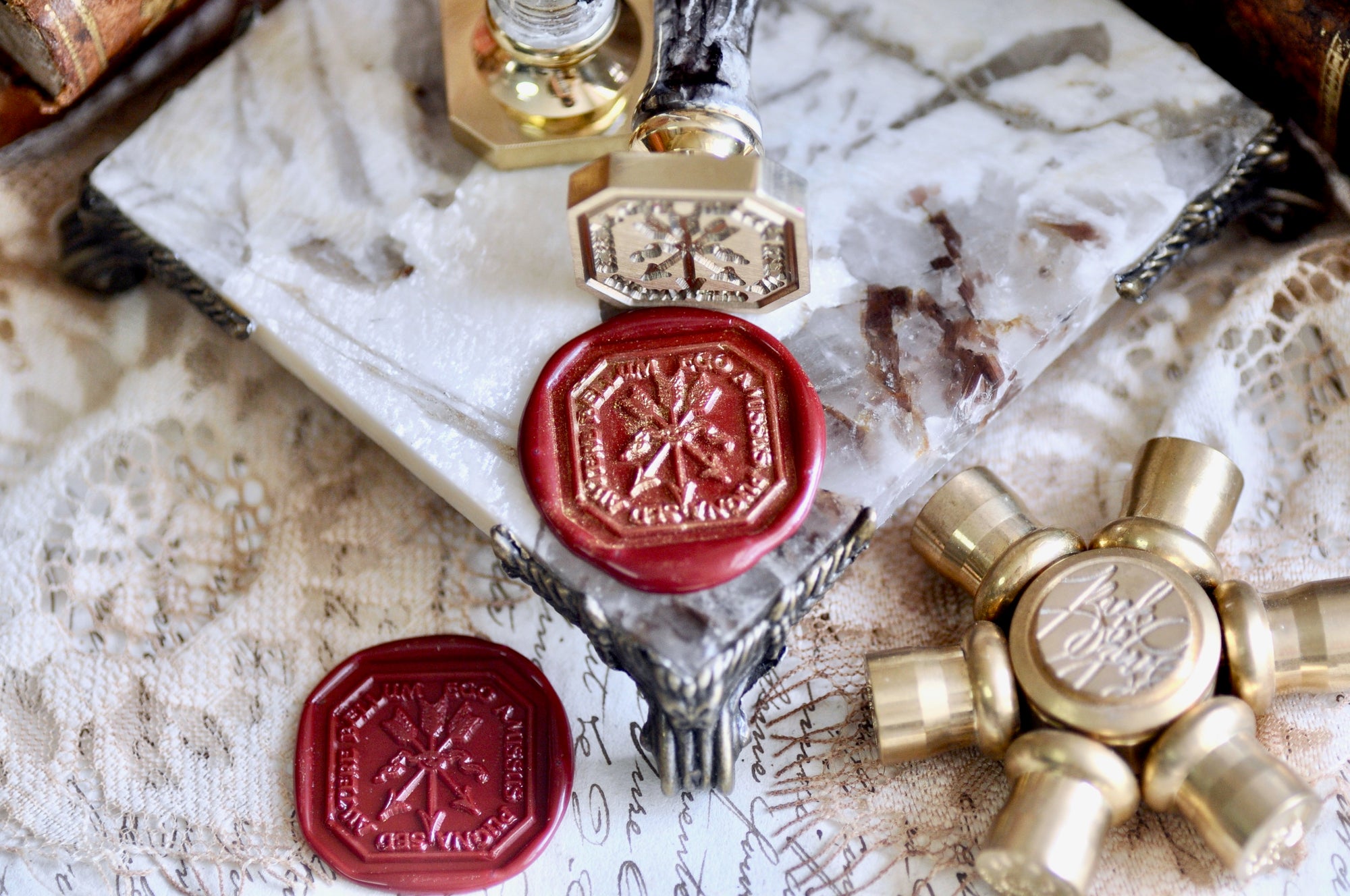 Our wax seal stamp is made with brass and comes with our complimentary signature handle in your color of choice (subject to availability, see important note for details).